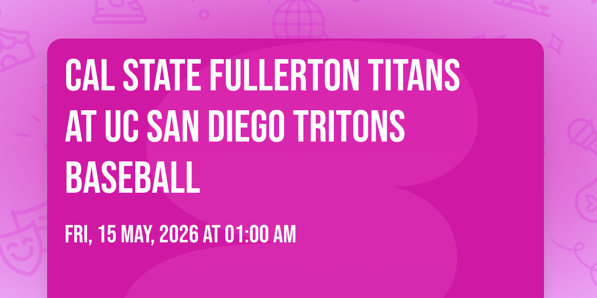 📍 Location: 32.8809, -117.23🎉 Welcome to Cal State Fullerton Titans at UC San Diego Tritons Baseball, where dreams come alive and possibilities are endless! 🏛️ Join us at Triton Ballpark in the heart of San Diego, CA for an event that defies expectations. 📅 On May 16th, 2026 at 09:00 PM, be part of something truly extraordinary as we bring together innovation, entertainment, and pure magic. ✨ Every aspect has been carefully designed to ensure an unforgettable experience for all our guests. Whether you're seeking adventure, inspiration, or simply a break from the ordinary, this event promises to deliver beyond your wildest dreams. 🎊 Prepare for a journey into the extraordinary!