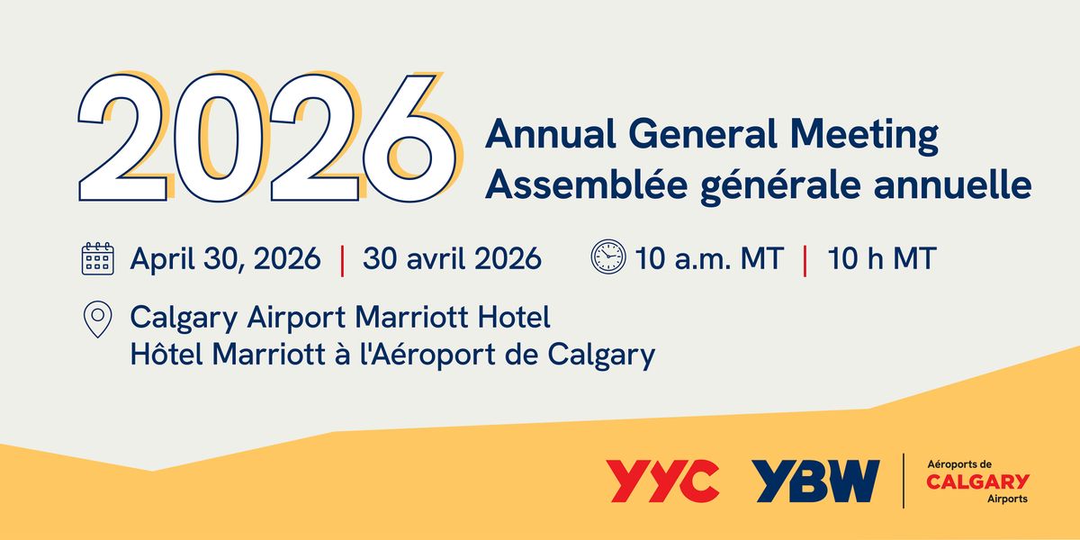 Join Calgary Airports for our 2026 Annual General Meeting & Lookahead, where we will share highlights from our 2025 Annual Report, provide an overview of our performance and priorities, as well as plans for the future of YYC, YBW and Calgary Airports.