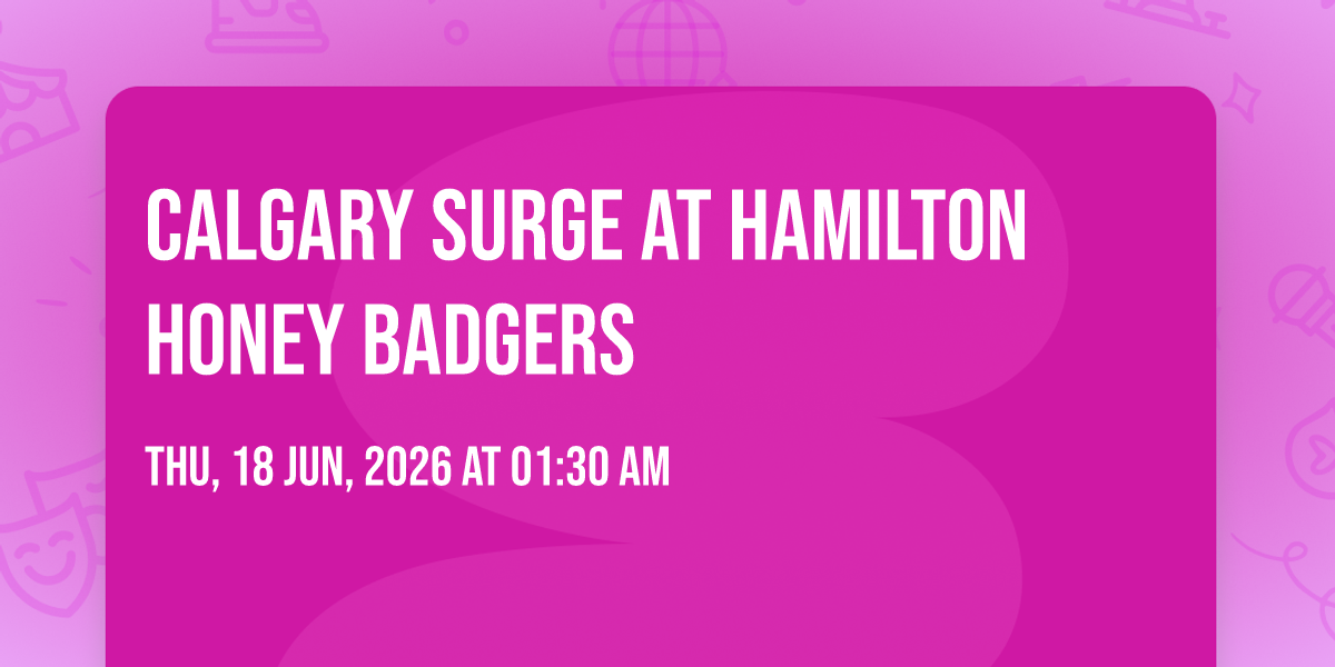 📍 Location: 51.0073, -114.146✨ Embark on an extraordinary journey at Calgary Surge at Hamilton Honey Badgers, where every moment promises to be unforgettable! 🌟 Imagine of transforming WinSport Event Centre in the heart of Calgary, AB into a realm of endless possibilities. 📅 Join us on June 18th, 2026 at 01:30 AM for an experience that will challenge your imagination and exceed your expectations. 🎯 This carefully curated event combines the finest elements of entertainment, innovation, and community spirit. Whether you're an adventure seeker, culture enthusiast, or someone looking for unique experiences, this event offers something special for everyone. 🎊 Don't miss this chance to be part of something extraordinary!