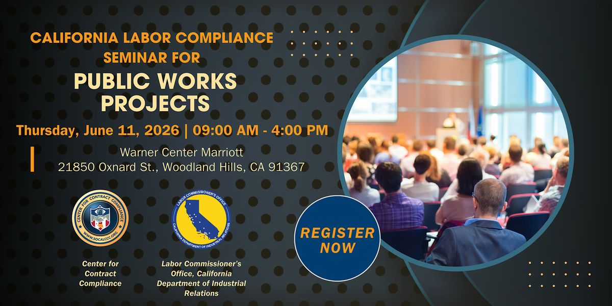 Get up to speed on California’s labor compliance requirements for public works projects at this comprehensive, in-person seminar. Hosted by the Center for Contract Compliance in partnership with the Department of Industrial Relations, Labor Commissioner’s Office, this event brings industry experts together for a full day of education and connection at the Warner Center Marriott Woodland Hills. Attendees will gain practical insight into current regulations, compliance expectations, and proven best practices. Designed for contractors, subcontractors, and public agency professionals, this seminar is an essential opportunity to stay informed and compliant in California’s public works environment.