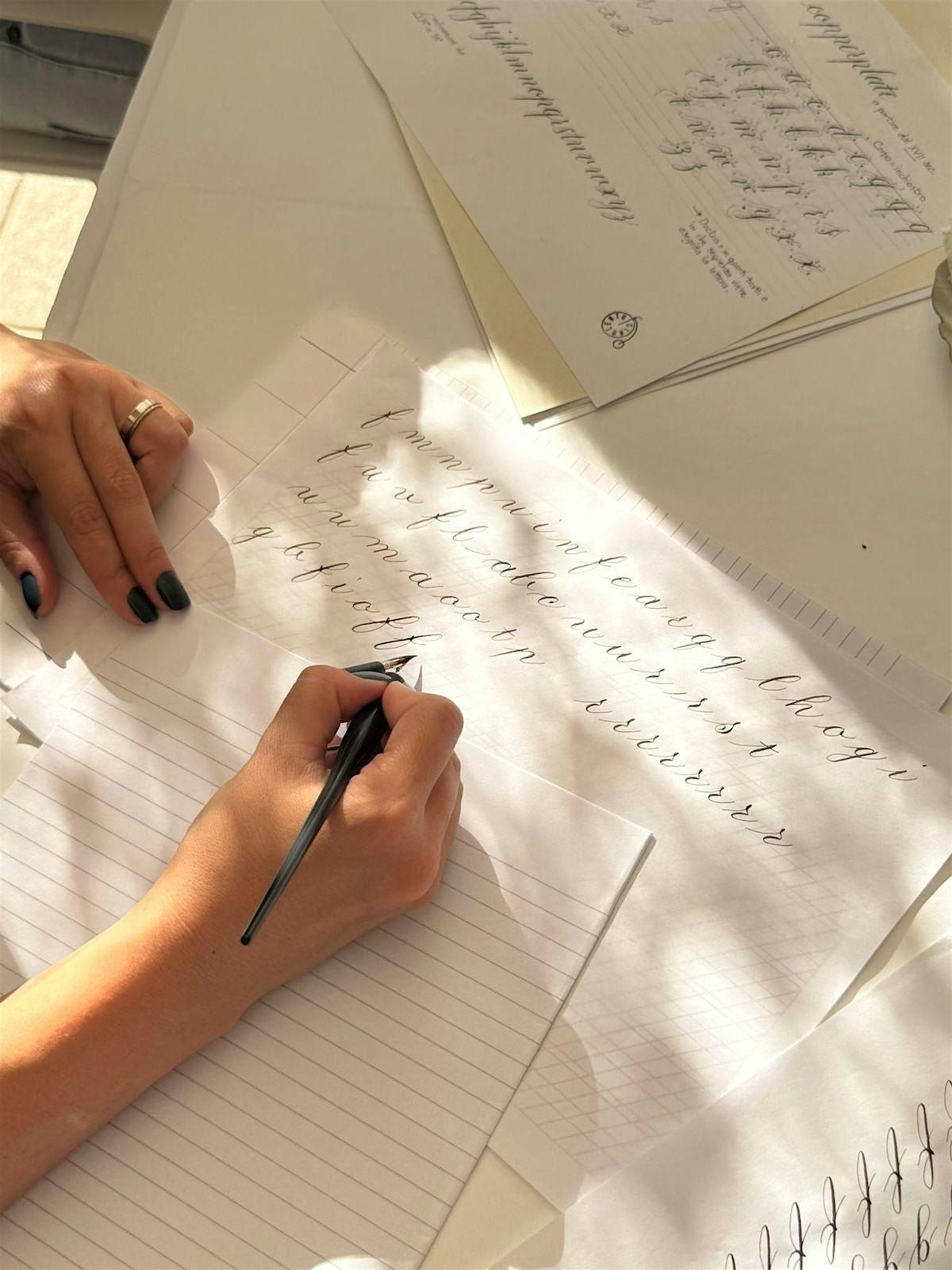 We’ll start from the very beginning: how the pointed pen works, how to hold it, how to create smooth, controlled strokes and how those strokes build elegant letters. Step by step, you’ll go from simple lines to your first finished word