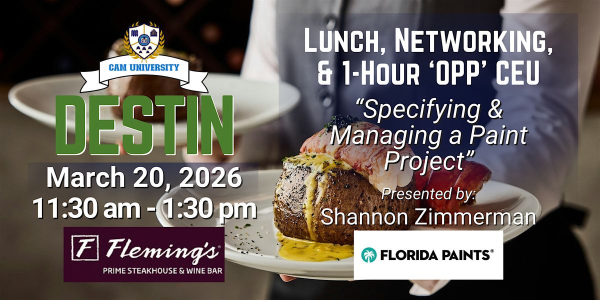 Join us for a fabulous lunch at Fleming's and hear from Shannon Zimmerman of Florida Paints as she presents a 1-hour 'OPP' CEU: "Specifying & Managing a Paint Project." Get your CEU, network with great business partners, and have an amazing lunch! 11:30 am - 1:30 pm