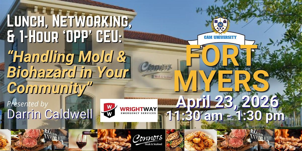 Join us at The Connors in Ft. Myers on April 23 for a complimentary lunch plus networking, and a 1-hour "OPP" CEU by Darrin Caldwell of Wrightway Restoration called "Handling Mold & Biohazard in Your Community." Get your CEU, network with great business partners, and enjoy lunch and drinks! 11:30 am - 1:30 pm