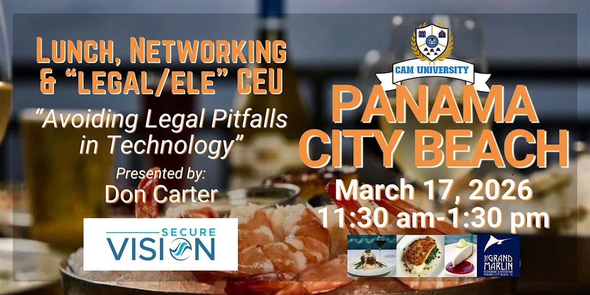 Join us for a fabulous complimentary lunch at The Grand Marlin and hear from Don Carter of Secure Vision as he presents a 1-hour 'LEGAL/ELE' CEU on "Avoiding Legal Pitfalls in Technology." Get your CEU, network with business partners, and have a fantastic lunch! 11:30 am - 1:30 pm