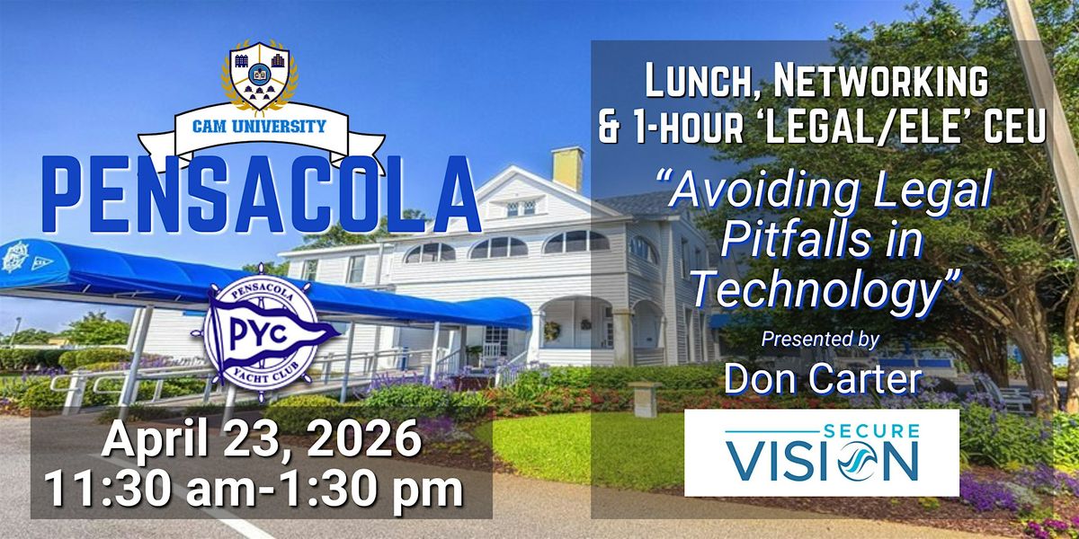 Join us for a fabulous complimentary lunch at Pensacola Yacht Club and hear from Don Carter of Secure Vision of CAM U as he presents a 1-hour 'Legal/ELE' CEU: "Avoiding Legal Pitfalls in Technology." Get your CEU, network with business partners, and have a fantastic lunch! 11:30 am - 1:30 pm