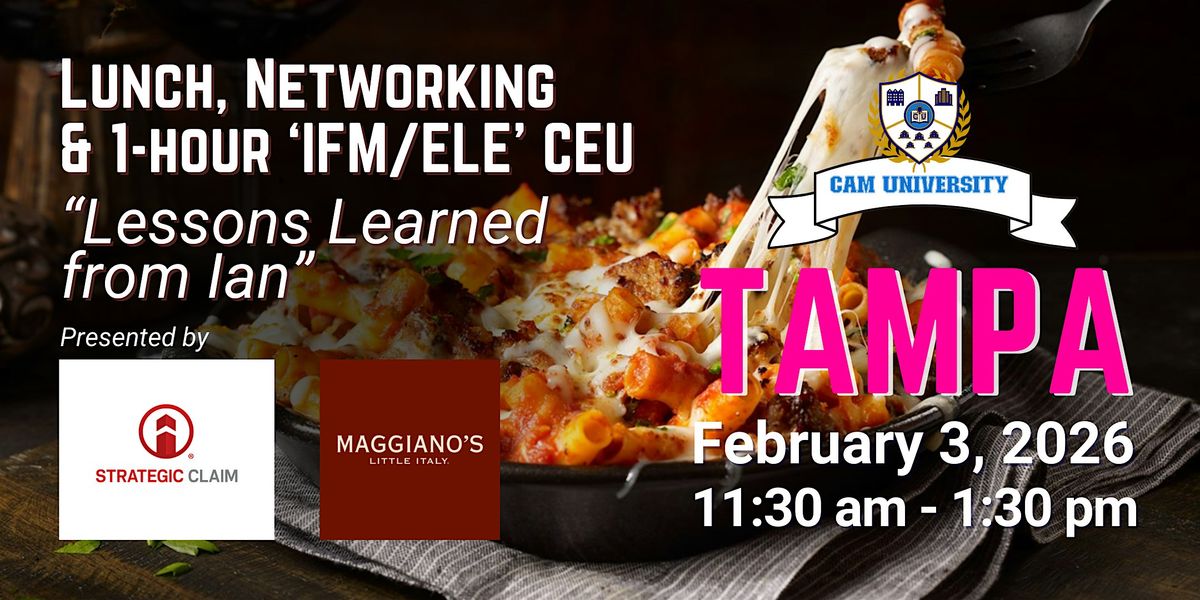 Join us for a fabulous lunch and hear from Strategic Claim Consultants, as she presents a 1-hour 'IFM/ELE' CEU called "Lessons Learned from Ian" Network with colleagues, socialize, get a CEU credit, and enjoy an amazing lunch! 11:30 am - 1:30 pm
