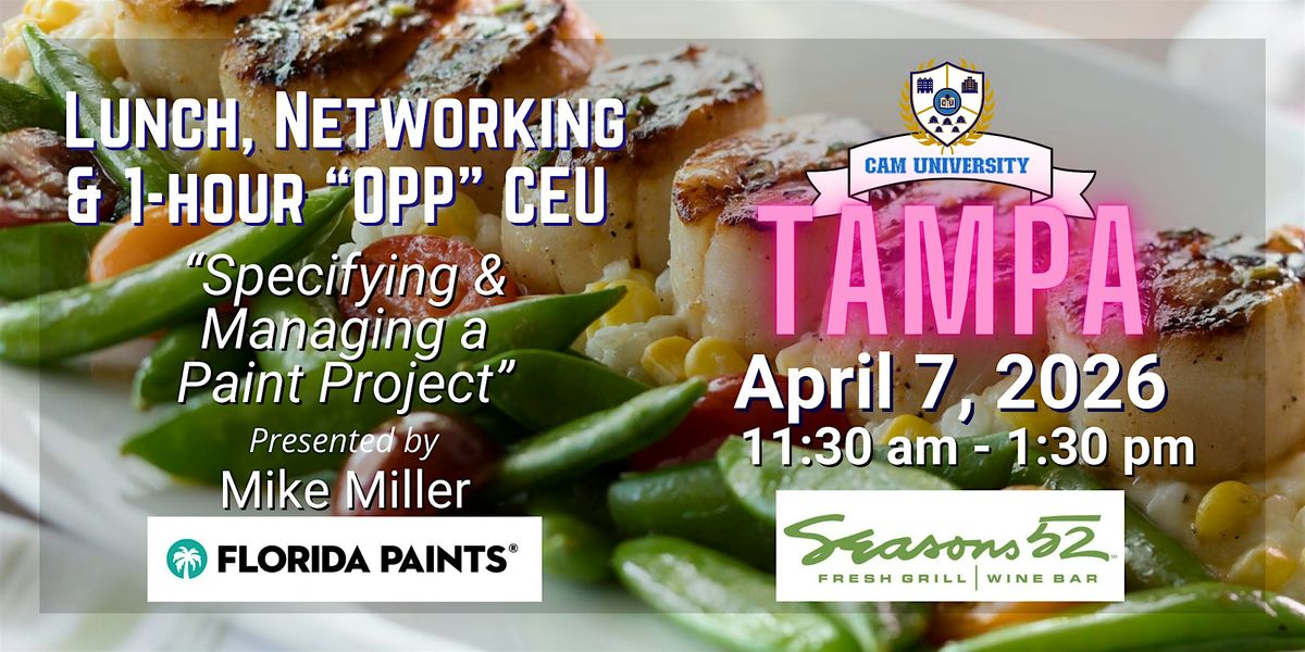 Join us for a fabulous lunch and hear from Mike Miller of Florida Paints, as he presents a 1-hour 'OPP' CEU called "Specifying & Managing a Paint Project." Network with colleagues, socialize, get a CEU credit, and enjoy an amazing lunch! 11:30 am - 1:30 pm