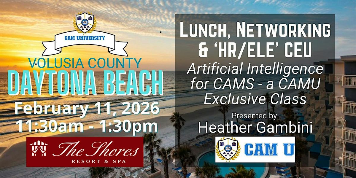 Join us for a fabulous complimentary lunch at Daytona Beach Shores Resort & Spa and hear from Heather Gambini of CAM U as she presents a 1-hour 'HR/ELE' CEU: "Artificial Intelligence for CAMS- A CAM U Exclusive Class." Get your CEU, network with great business partners, and have an amazing lunch! 11:30 am - 1:30 pm