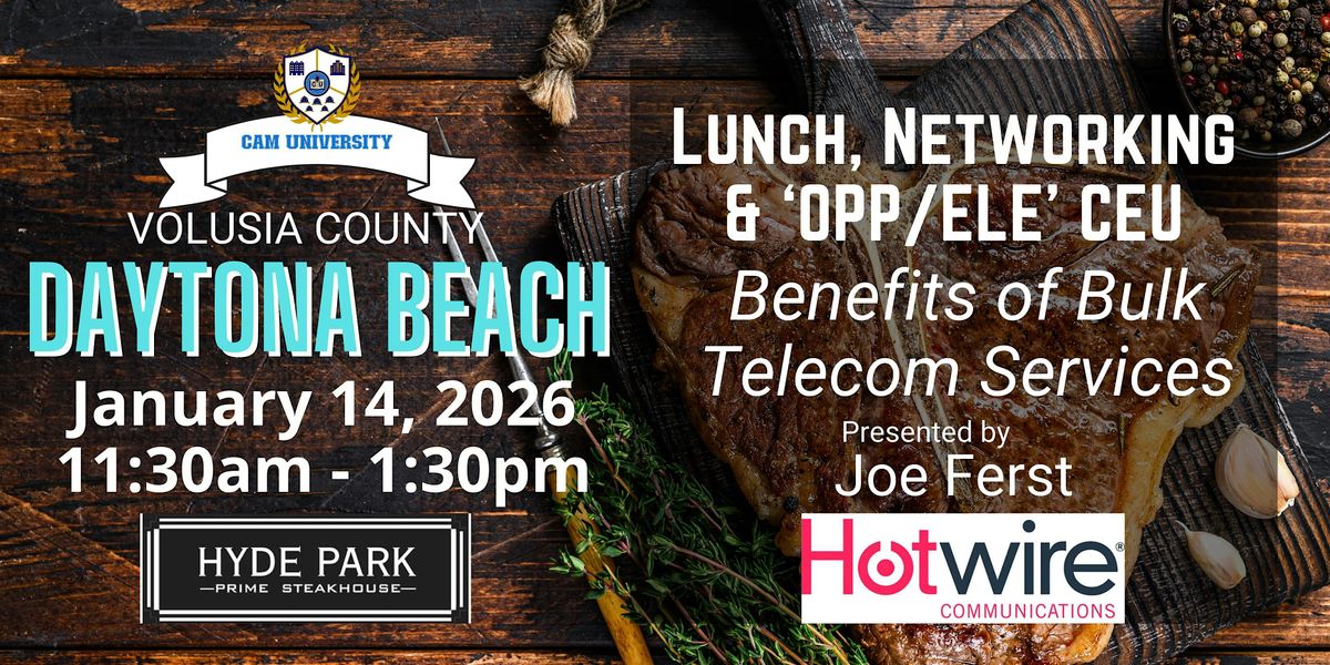 Join us for a fabulous complimentary lunch at Hyde Park and hear from Joe Ferst of Hotwire Communications as he presents a 1-hour 'OPP/ELE' CEU: "Benefits of Bulk Telecom Services." Get your CEU, network with great business partners, and have an amazing lunch! 11:30 am - 1:30 pm