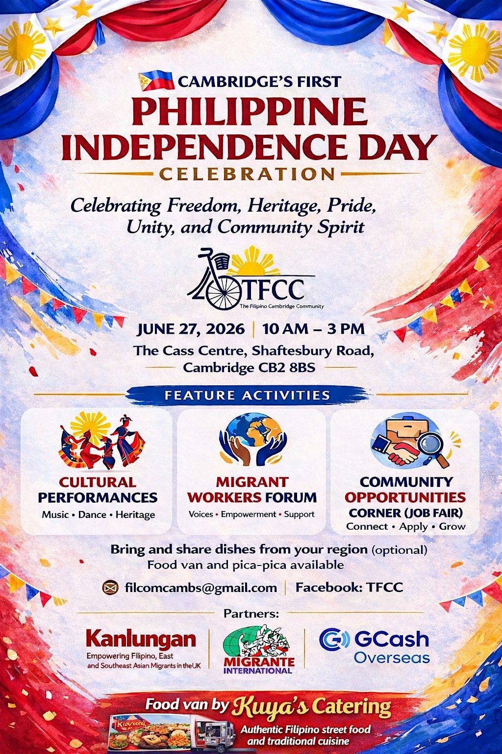 Join us at the Cass Centre on June 27, 2026 at 10:00 AM (BST) for a fun and lively day celebrating Philippine Independence Day! Expect great food, music, and awesome company as we mark this special occasion together. Don’t miss out on the chance to connect with the community and enjoy a memorable event in Cambridge. See you there!