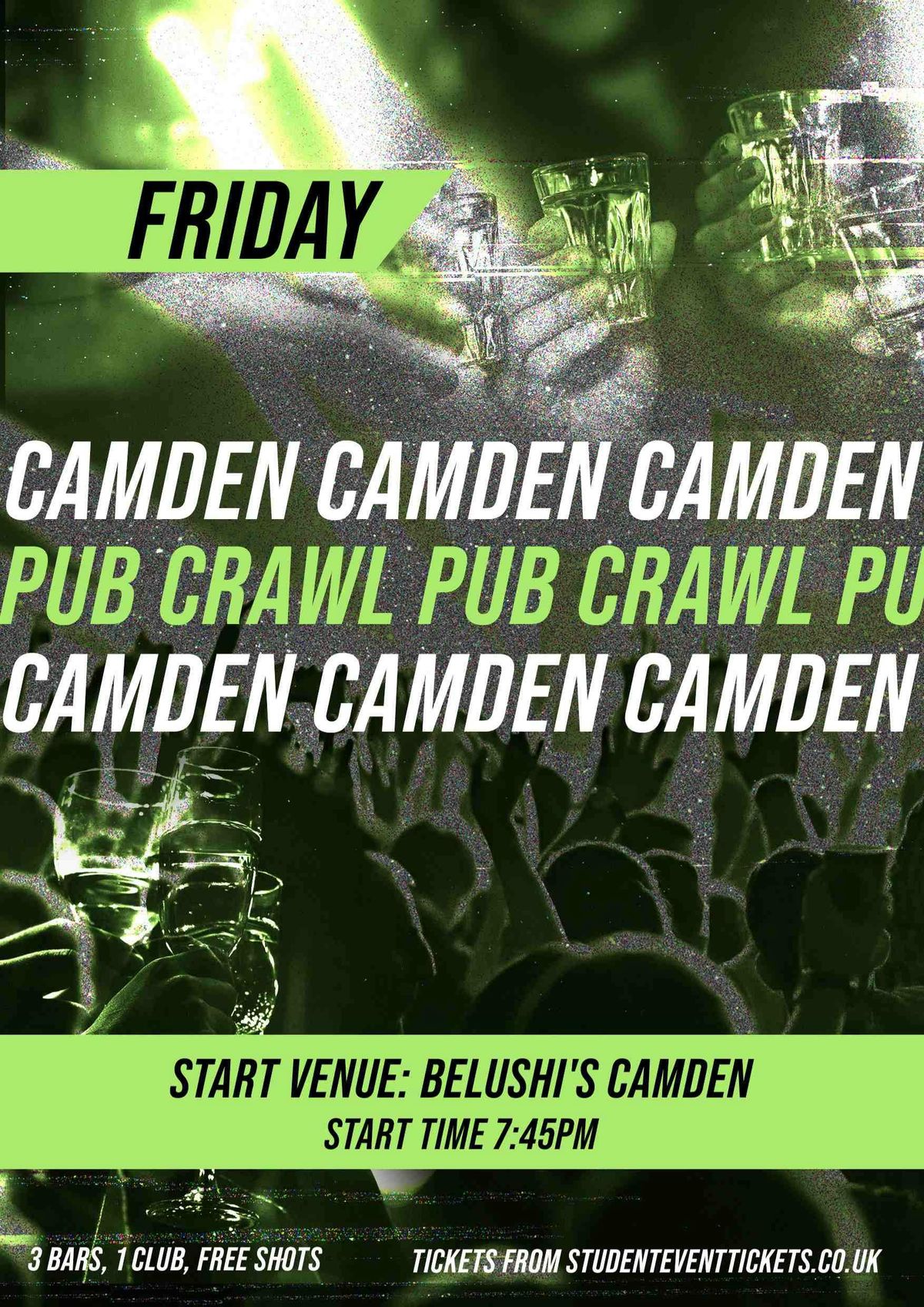 What better way to explore Camden on a Friday night than with a pub crawl?Meet us at Belushi's Camden at 7:45pm and visit four pubs and one club, doing FREE shots along the way!Are you part of a large group or society? Let us know who you are at [email protected] ticket is an exclusive student price for the Pub Crawl around some of our favourite spots in Camden🤪📍 Address: 48-50 Camden High St, London NW1 0LT🚇 Nearest Tube: Camden Town📣 Entry: Start time is 19:45pm🆔 Physical ID Required: Remember to bring your physical ID; unfortunately, we cannot accept photos or scans on your phone.🎫 Ticket Name: Make sure your ticket name matches your ID name for a smooth entry.Disclaimer: