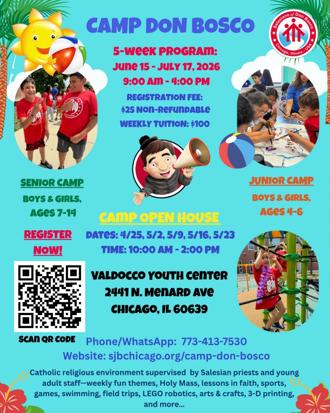 For over 25 years, our parish of St. John Bosco-St. James has been running Camp Don Bosco for kids. Our camp is led and animated by our Salesian priests and brothers, along with well-trained young adults and high school students of our parish. This camp takes place at our site of St. James Church (5730 W. Fullerton Ave, Chicago, IL 60639), which is on the same city block as our Camp Office/Valdocco Youth Center (2441 N. Menard Ave, Chicago, IL 60639). We have weekly fun themes, Holy Mass, lessons in the Catholic faith, sports, games, swimming, field trips, LEGO robotics, arts & crafts, 3-D printing, and more… For more info, please see our website: https://www.sjbchicago.org/camp-don-bosco