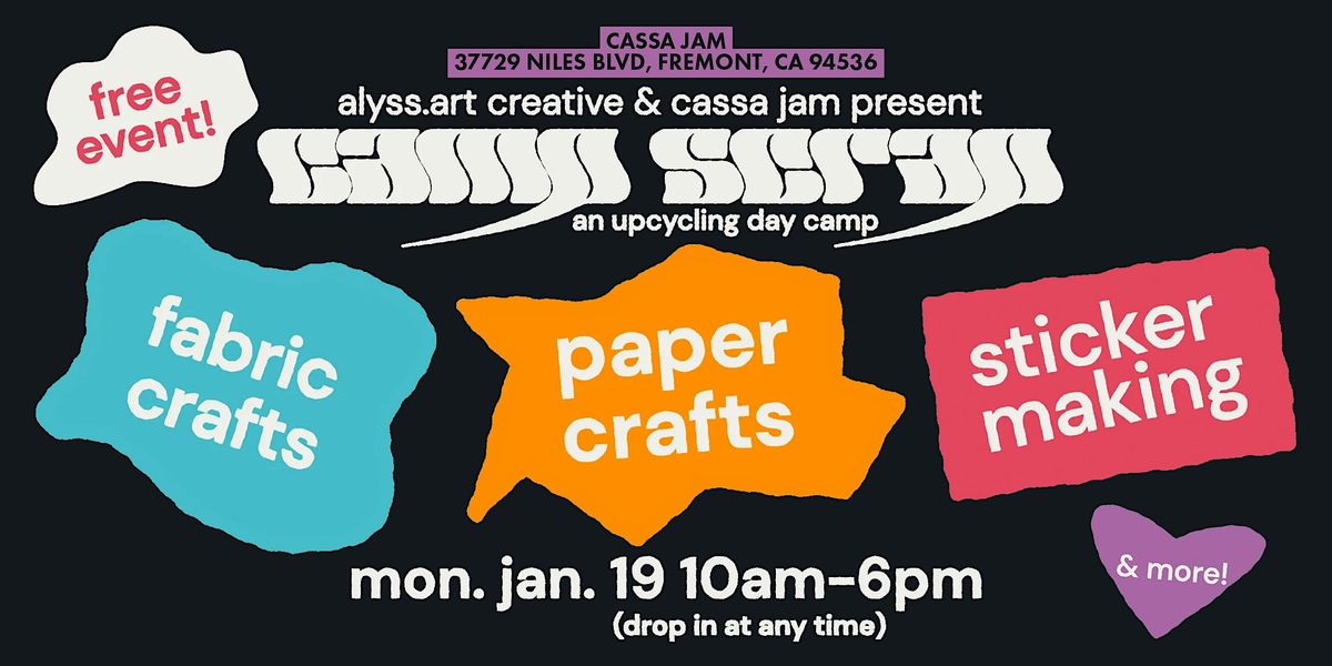 Camp Scrap is looking for fun, vibrant, curious, experimental campers to join us for a FREE sustainability-focused day camp! Come drop in anytime between 10AM-6PM on Monday, January 19 (MLK Day) to create the craft of your dreams 💫 Supplies are first come, first serve but there will probably be more than anybody needs.