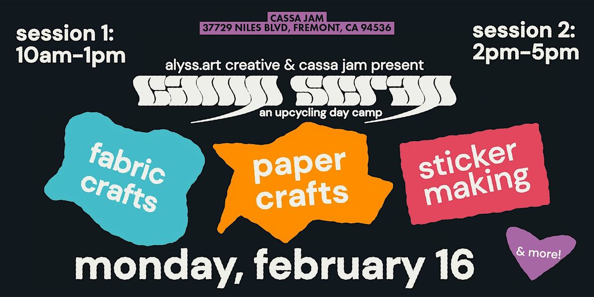 Camp Scrap is looking for fun, vibrant, curious, experimental campers to join us for a sustainability-focused day camp! Come drop in between two sessions on Monday, Feb 16 (Presidents' Day) to create the craft of your dreams 💫 Session 1 is 10am - 1pm, Session 2 is 2pm - 5pm. Sliding scale donations, suggested donation $10, thanks again!