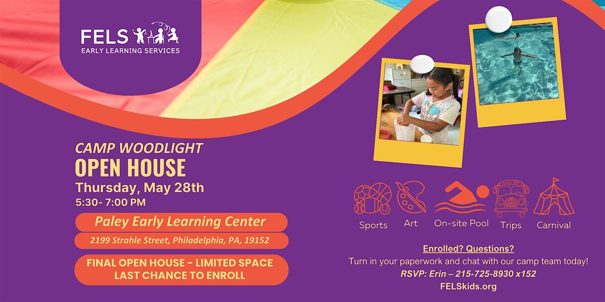 Join us for our Final Camp Woodlight Open House on Thursday, May 28th, from 5:30 – 7:00 PM at Paley Early Learning Center, located in Northeast Philadelphia (2199 Strahle Street, Philadelphia, PA).