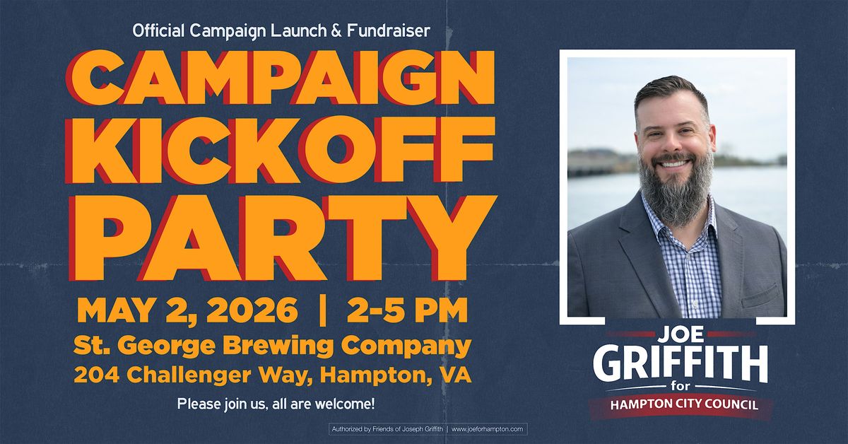 Come out and support Joe Griffith as he officially launches his run for Hampton City Council! This is an awesome chance to meet with Joe and connect with fellow community members who care about the future of Hampton. Bring your friends and neighbors and get ready for a fun, casual afternoon with live music, giveaways, and most importantly, celebrating the start of something great together. Don’t miss it!