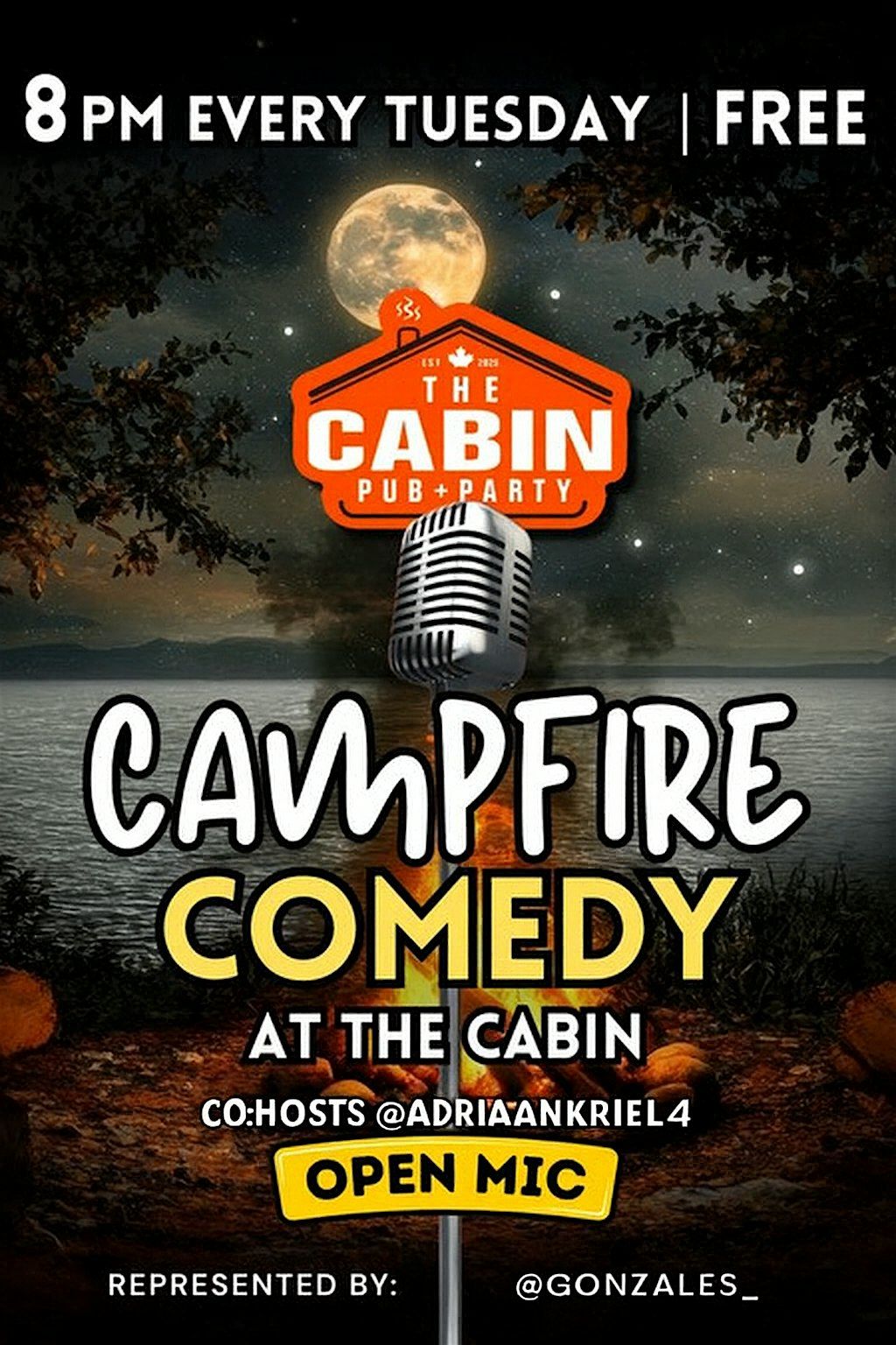 Campfire Comedy at The Cabin is a free weekly open mic hosted by Keveen Gonzalez. Local comedians and first timers test new jokes in a cozy room with good drinks and a laid back crowd.