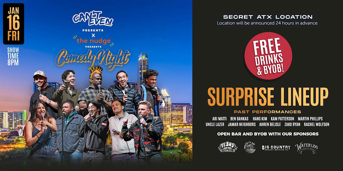 Can't Even Comedy is excited to bring you another incredible Nudge exclusive comedy experience. Our venue location is a secret but is truly one of kind. We have liquor brands sponsoring FREE DRINKS OR YOU MAY BYOB . Our bar sponsors include Waterloo Sparkling Water, Big Country Beer Co, Tejas Tonic and White Claw.Great night filled with comedy and giveaways with some of best comics from Austin, LA and NYC and maybe a few surprises!