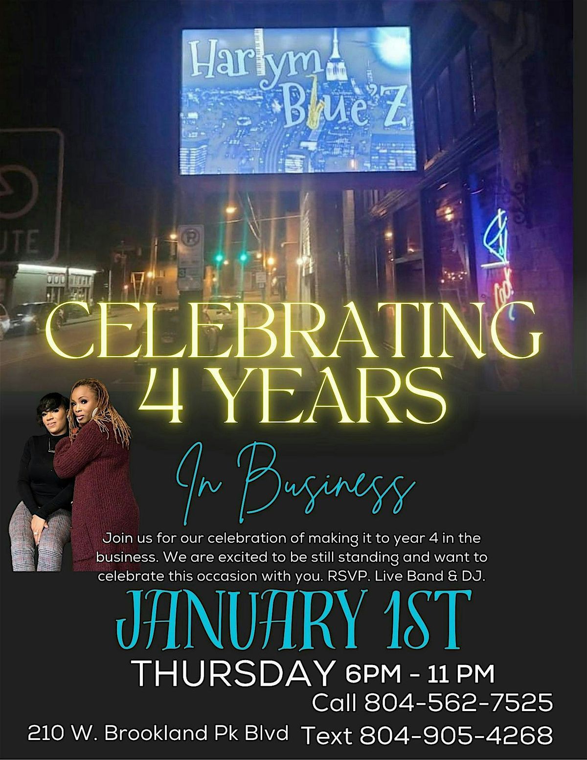 We're throwing an awesome party to mark 4 amazing years together as Harlym Blue'Z. Come join the fun, share some laughs, and make memories with friends old and new food, drinks, and music. Can't wait to see you there!