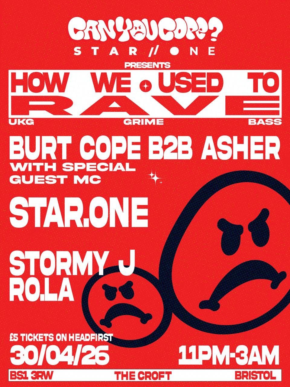 Old school rave ethos meets new UKG energy as Can You Cope & Star.One link up for a heavyweight session at The Croft. A stacked lineup of UKG, 140 and grime..Burt Cope b2b Asher + Special Guest MCStar.OneStormy JRo.LaDon't Sleep.Disclaimer: