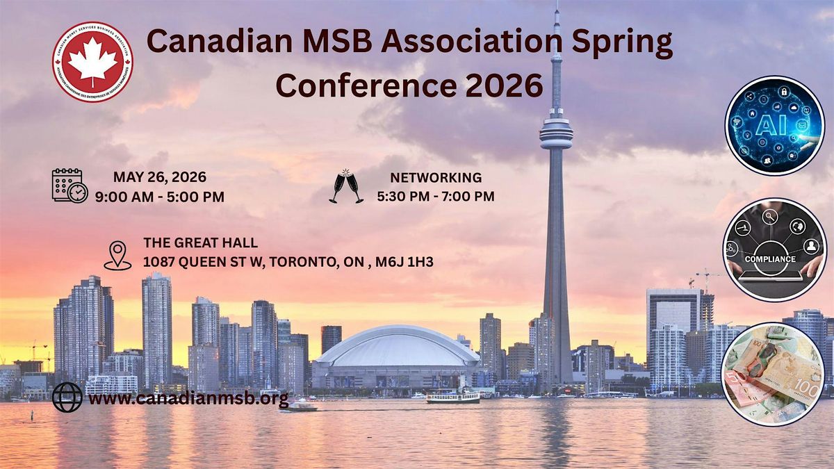 Now is your chance to reserve your spot and grab a ticket for the Canadian MSB Association Spring Conference 2026 happening on May 26, 2026, from 9 am - 5 pm each day at The Great Hall , 1087 Queen St W, Toronto, ON, M6J 1H3.