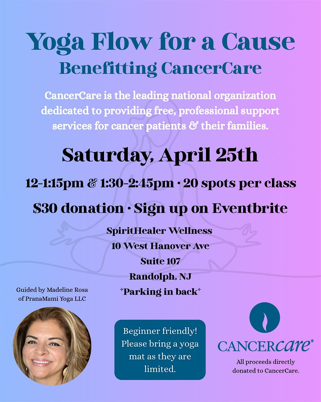 Join us for a beginner-friendly yoga event benefiting CancerCare, the leading national organization dedicated to providing free, professional support services for cancer patients and their families. Enjoy a gentle, relaxing meditation and yoga flow class for a great cause guided by Madeline Rosa of PranaMami Yoga, LLC!