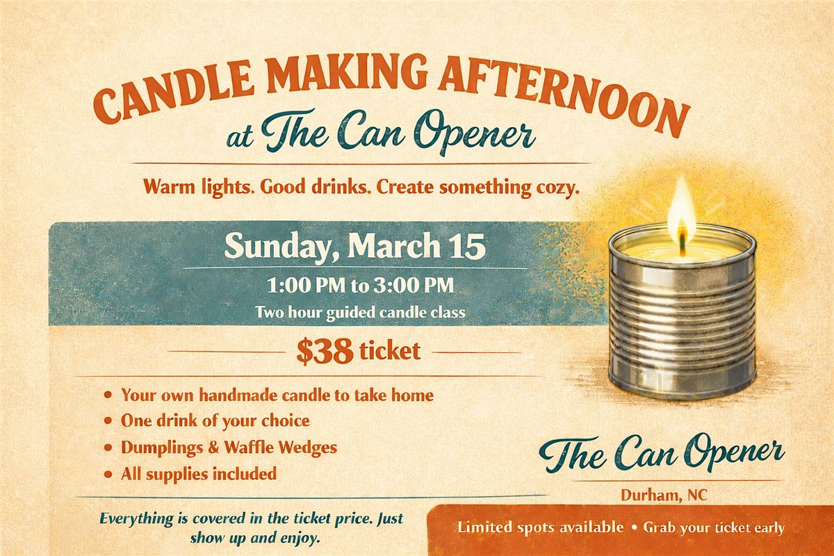 Join us for a cozy and creative afternoon at Candle Making Night at The Can Opener in Durham. On Sunday, March 15 from 1:00 PM to 3:00 PM, enjoy a relaxed two hour guided candle making experience where you will create your own handmade candle to take home.