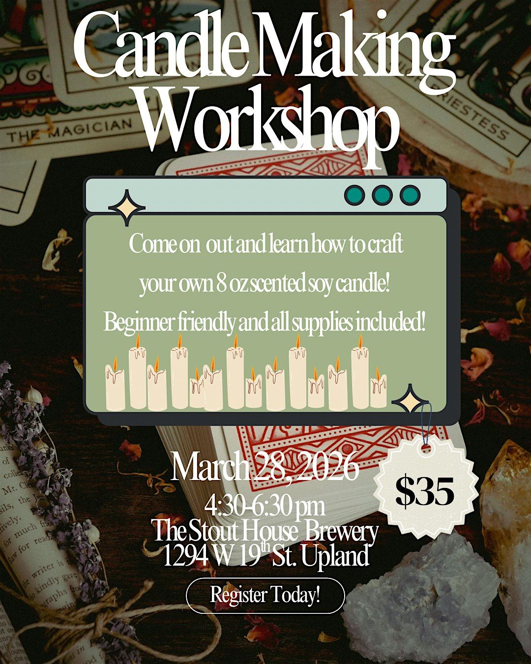 Come out out and learn to craft your own 8 oz soy candle! Learn about wax types, fragrance blends, and take home a custom non toxic candle