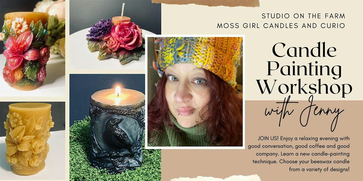 Grab your favourite people and join me for this fabulous candle-painting workshop! Choose a beeswax candle in advance of the class from a selection of floral and whimsical designs. Jenny will make your candles and let them cure before our class starts. During the class, you will learn how to paint candles with liquid candle dye. It creates a beautiful, artistic candle. This technique is not common, so you're learning something truly unique!