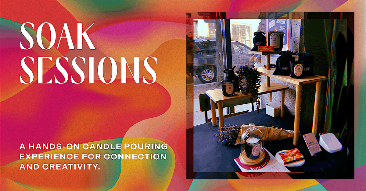 Join us in person for the very first SOAK Sessions where you'll get to dive into the art of candle pouring! This is your chance to tap into some creativity, meet fellow candle lovers, and walk away with your own handcrafted creation. No experience needed—just bring your enthusiasm (and your favorite drink!) and let the good vibes flow. Can't wait to see you there for a fun and chill session!