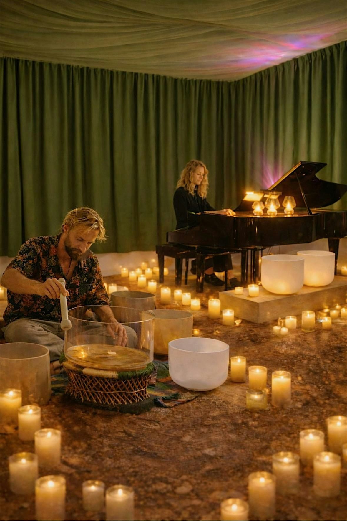 Mary Dreams on piano tuned to 432Hz and Charlie Demere on singing bowls invite you into a live, candlelit sound journey where healing frequencies create an immersive experience of deep relaxation and harmony.