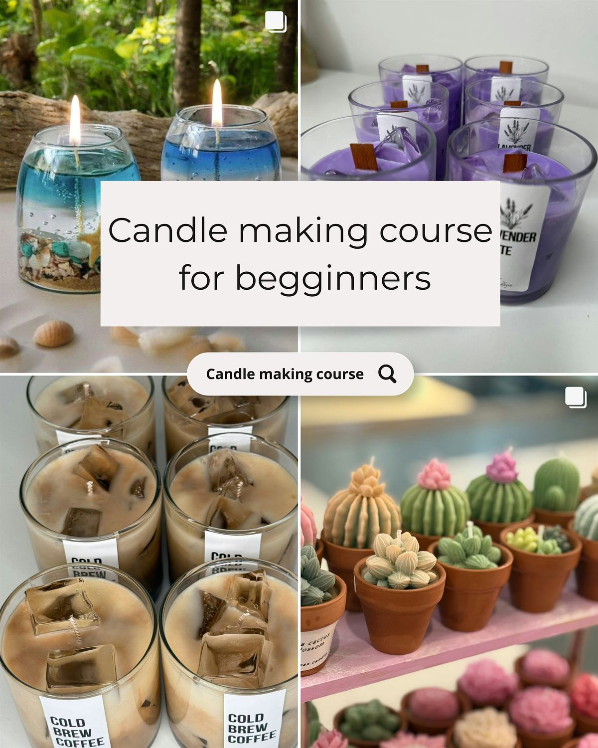 Throughout the course, you’ll create 6-8 beautiful and functional candle projects using different types of waxes, molds, colors, and scents. Every session is designed to teach a new technique, build your knowledge, and spark your creativity.