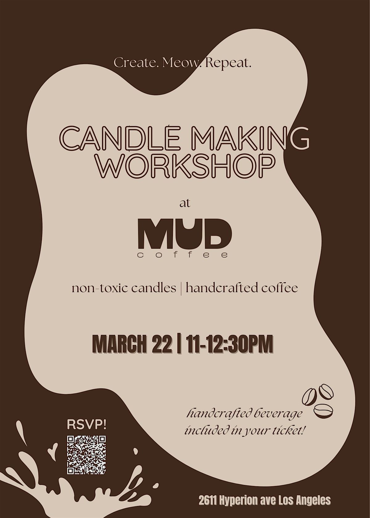 Join us for a hands-on candle making class at the brand new MUD Coffee in Silverlake, Los Angeles where you'll create your own clean burning coconut wax candle! Choose from a wide variety of non-toxic fragrances and learn about the process of creating a high quality candle from the CEO of Create. Meow. Repeat.! You'll walk away with 1 7.5oz candle of your own creation in an amber glass jar and a custom label. Your ticket includes a free handcrafted beverage, from matcha to lattes with a sweet cream cold foam and more! You'll have a chance to chat with your peers, sip on your bevvies, shop Create. Meow. Repeat. candles, get all your candle questions answered and wait for your candle to harden so you can take it home the same day! Sign up on your own or bring a friend, everyone is welcome, no experience necessary!