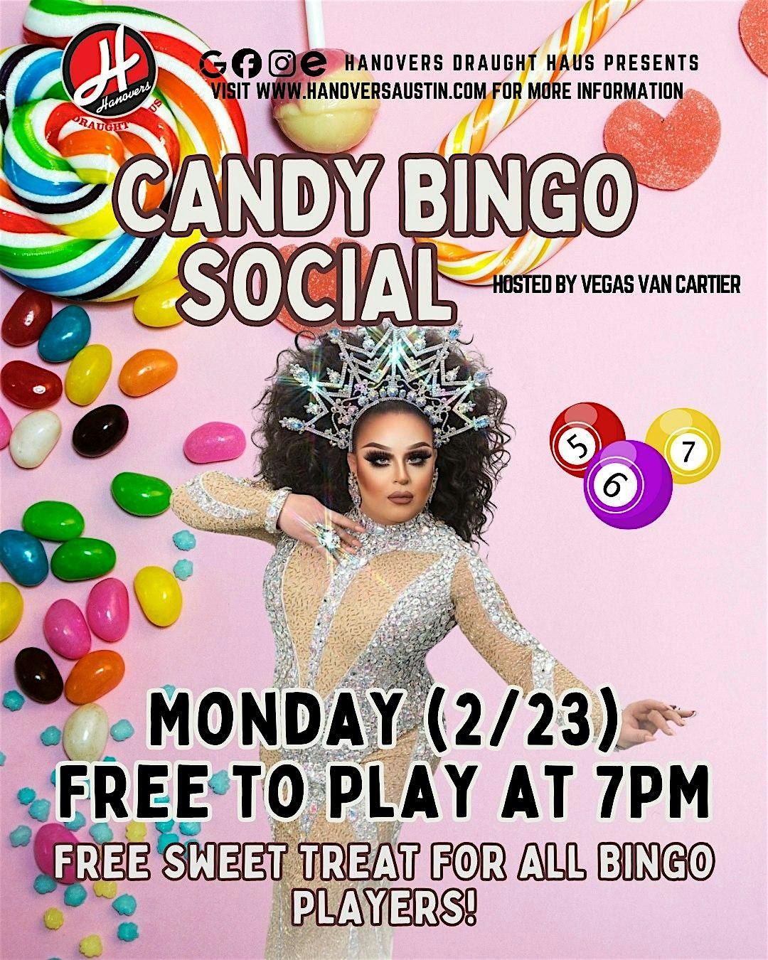 Welcome to Hanovers Drag Bingo Night! We are proud to co-host alongside Ms. Vegas Van Cartier to bring you a safe & pfun LGBTQIA+ event!