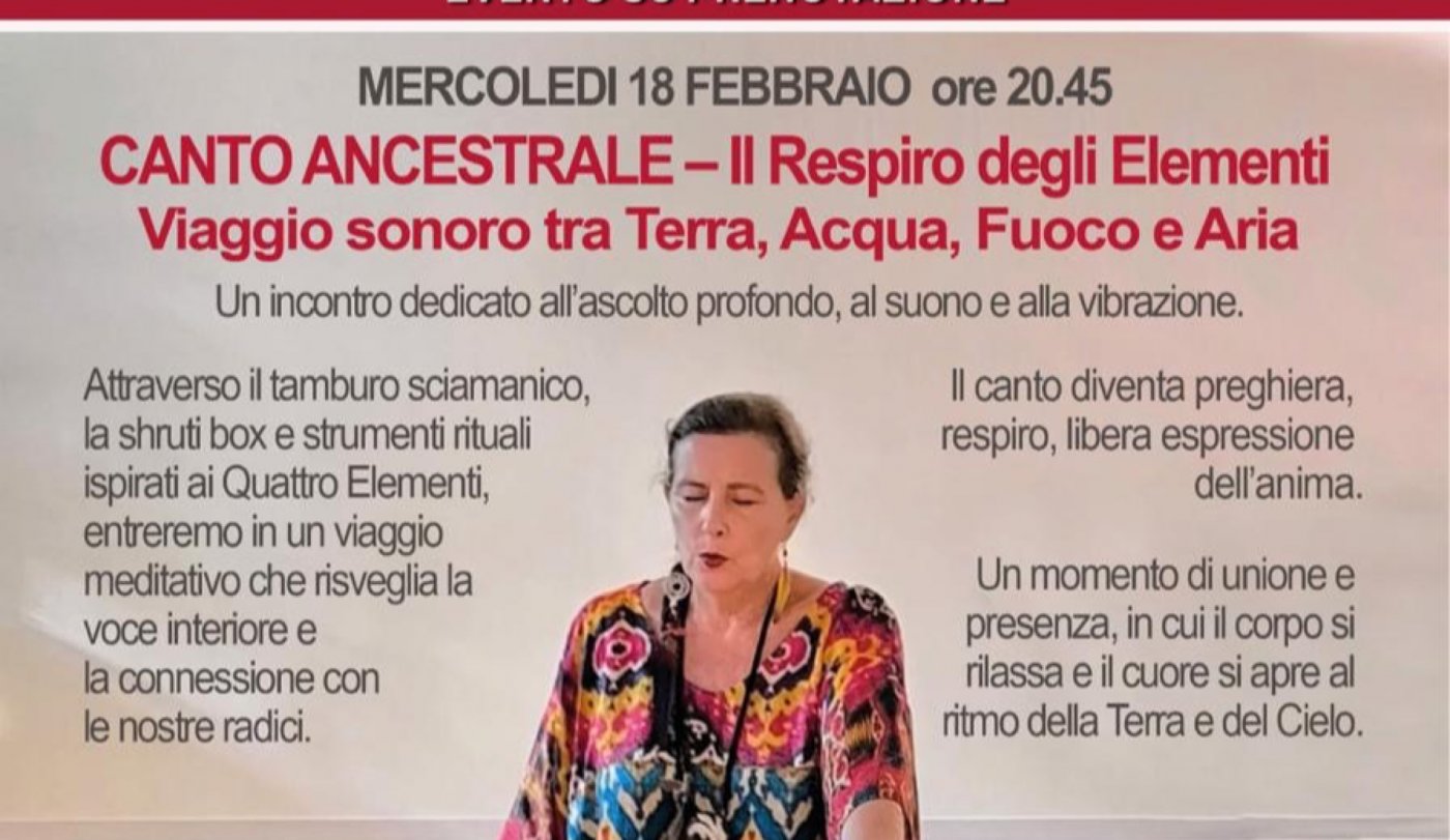 Attraverso il tamburo sciamanico, la shruti box e strumenti rituali ispirati ai Quattro Elementi, entreremo in un viaggio meditativo che risveglia la voce interiore e la connessione con le nostre radici.
