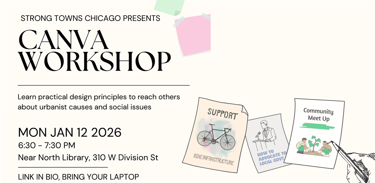 Join Strong Towns Chicago to learn how to use Canva to make flyers and other materials. This workshop is free and will cover basic design principles, with a focus on urbanism, so think safe streets for walking and biking, more housing, and so on.