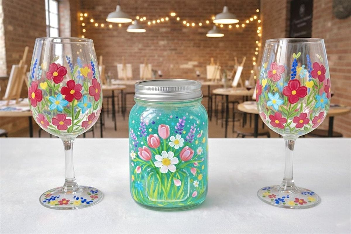 Join me for a relaxed, beginner-friendly DIY Paint & Sip experience where we’ll hand-paint a spring-inspired wine glass and matching mason jar on March 28 from 6:00 PM to 8:30 PM.