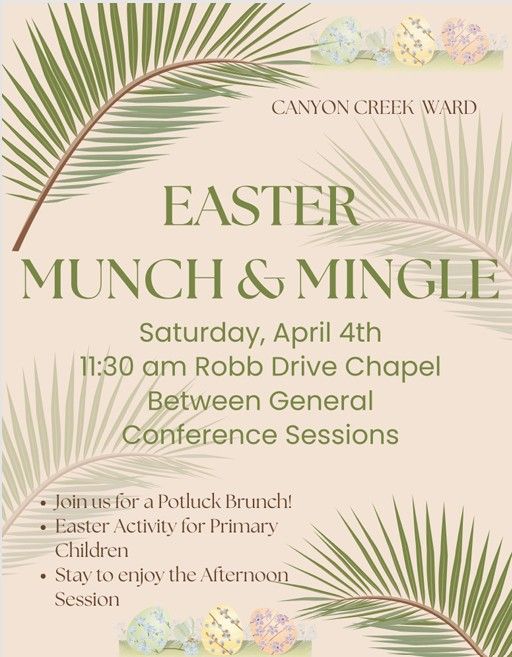 Join us Saturday morning for a potluck brunch--breakfast casseroles, fruit, and muffins. There will be an Easter activity for the children. You are invited to stay after brunch to watch the afternoon session of General Conference. We welcome friends and look forward to seeing you soon.
