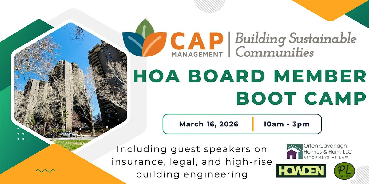 The CAP Management Board Member Boot Camp will provide information on subjects of legal compliance, insurance guidance, high-rise management, budget preparation, annual meetings, and governance policies. This is an event for members of HOA boards that are partnered with CAP as well as others that may be contracted with other management companies. The goal is to help with the understanding of complicated aspects of serving your association effectively. There will be six presentations and you can participate in all or just attend those that interest you. The agenda and schedule will help you choose.