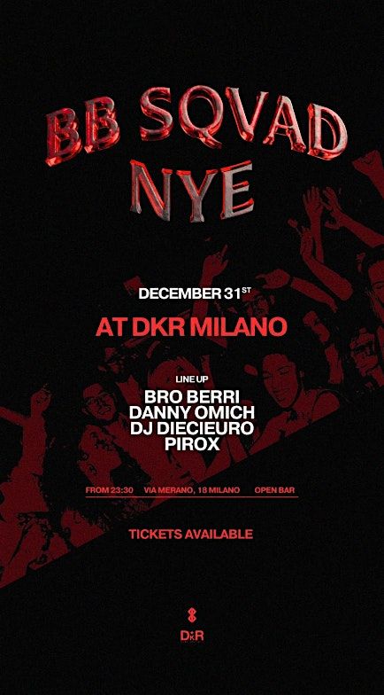 Capodanno open bar Milano al DKR: BB SQVAD NYE The Last Dance, ingresso 75€ open bar house & tech house all night. Info +39 335 529 0025