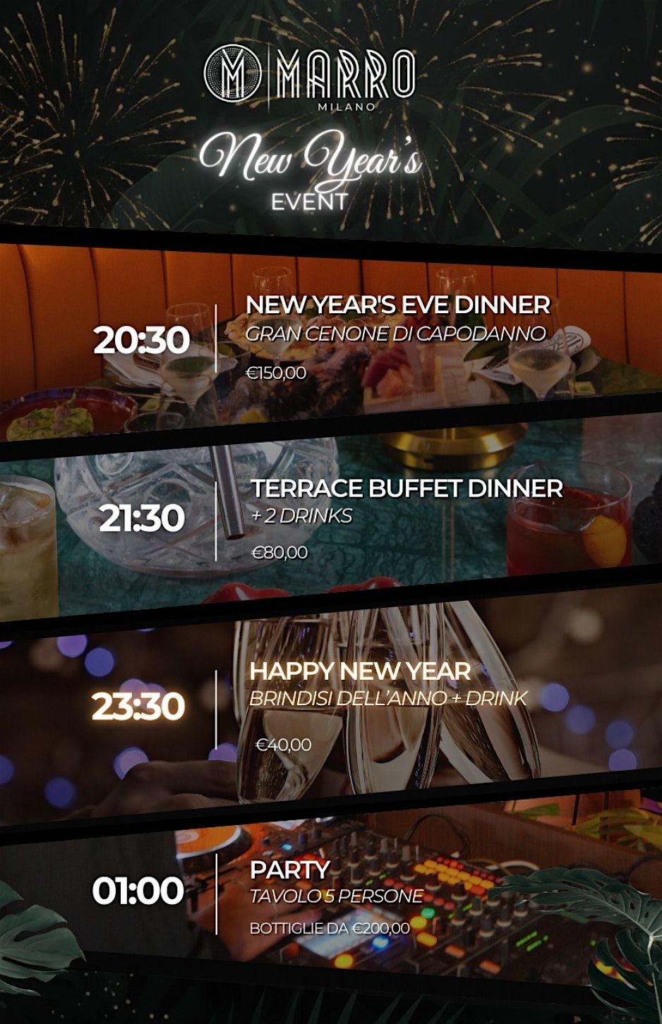Vivi l’ultimo dell’anno a Milano con stile e divertimento: al MarRo Milano potrai scegliere tra un elegante cenone servito, un buffet conviviale in terrazza, oppure unirti direttamente alla festa dopo cena. Una serata pensata per coppie, gruppi di amici o tavolate aziendali, con musica, brindisi di mezzanotte e DJ set per ballare fino all’alba