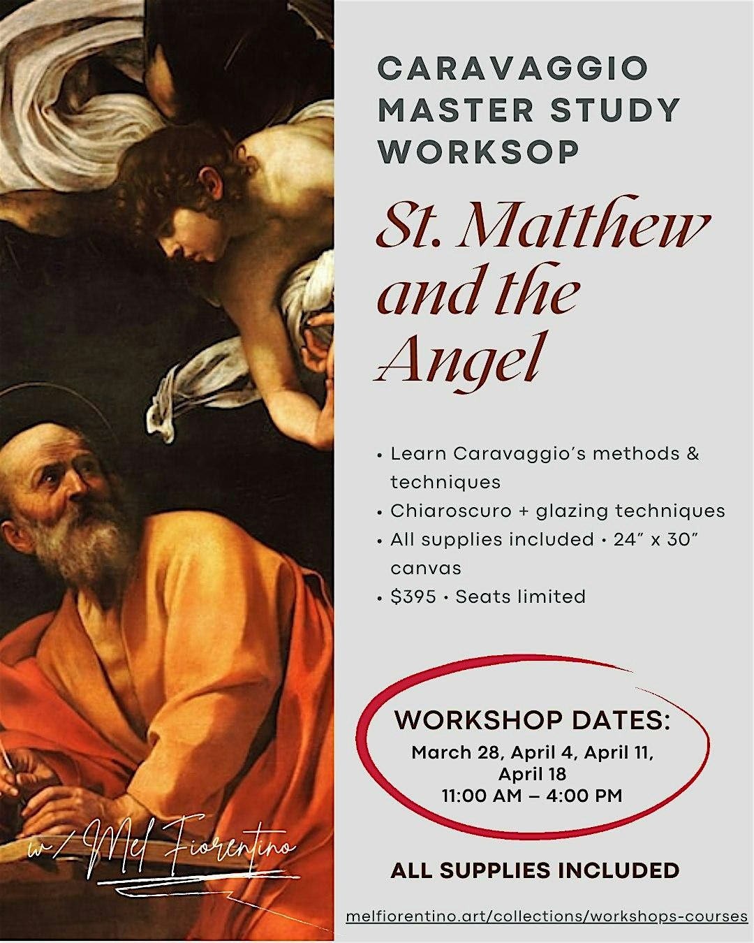 In this 4-week Saturday workshop, we’ll complete a master study of St. Matthew and the Angel by Caravaggio using a streamlined, beginner-friendly process: projector-assisted drawing, a fast raw umber wash, and oil layers that build toward a finished, gallery-ready result.