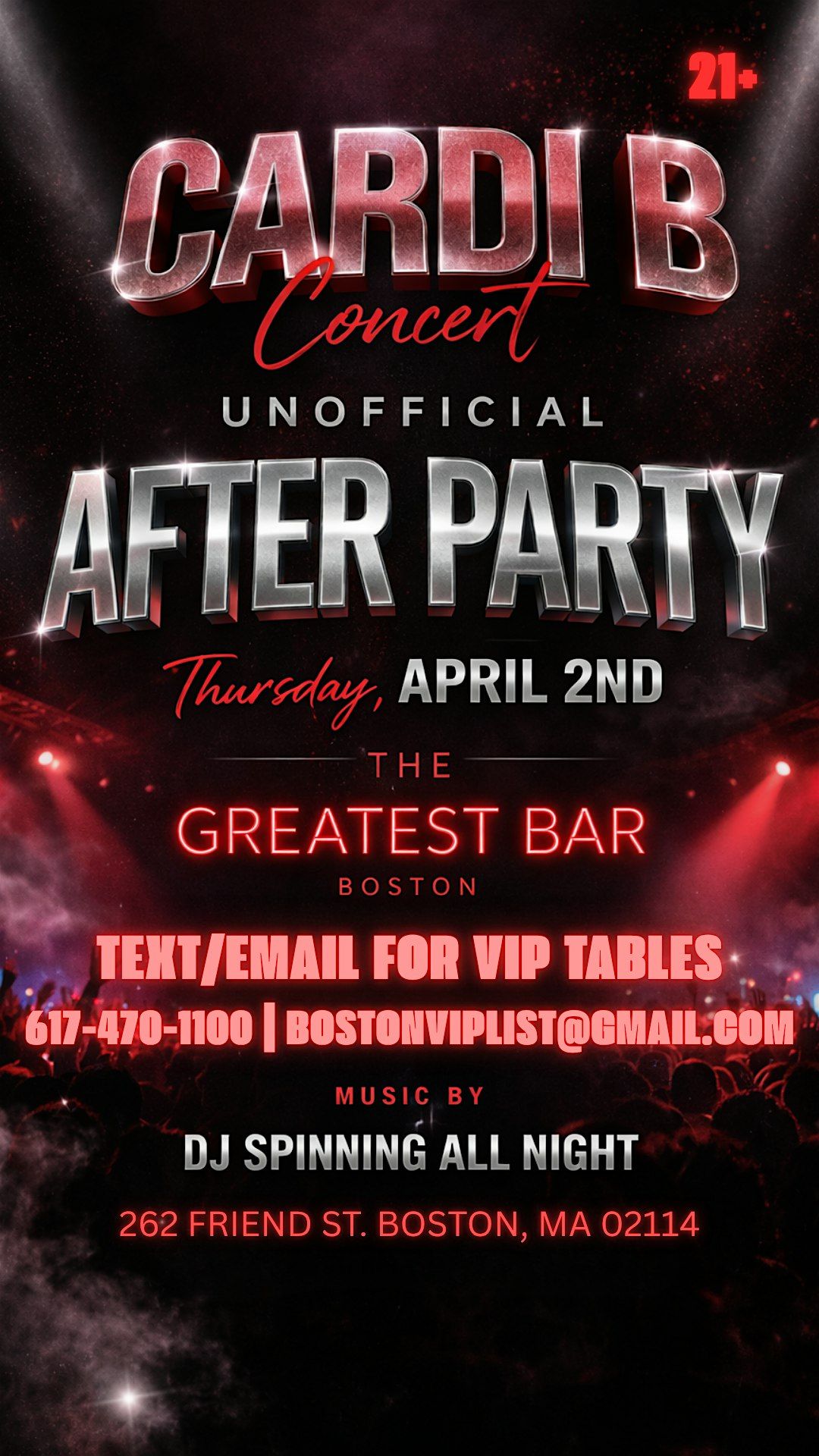 Join us at The Greatest Bar for the Unofficial Cardi B Concert After Party on Thursday, April 2nd — the city’s hottest post-show destination. We’re keeping the energy high all night with a packed dance floor, DJ spinning non-stop, and a crowd ready to turn all the way up.