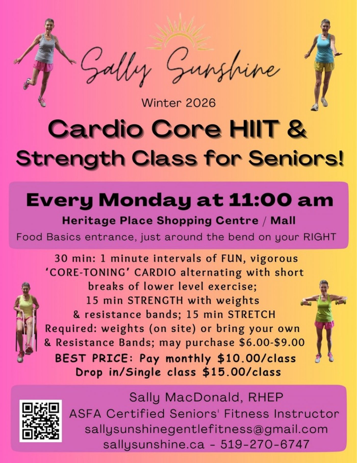 Looking for a cardio and strength class for seniors in Owen Sound? My Winter 2026 Cardio Core HIIT & Strength Class runs every Monday at 11:00 am at Heritage Place Mall, conveniently located near the Food Basics entrance.