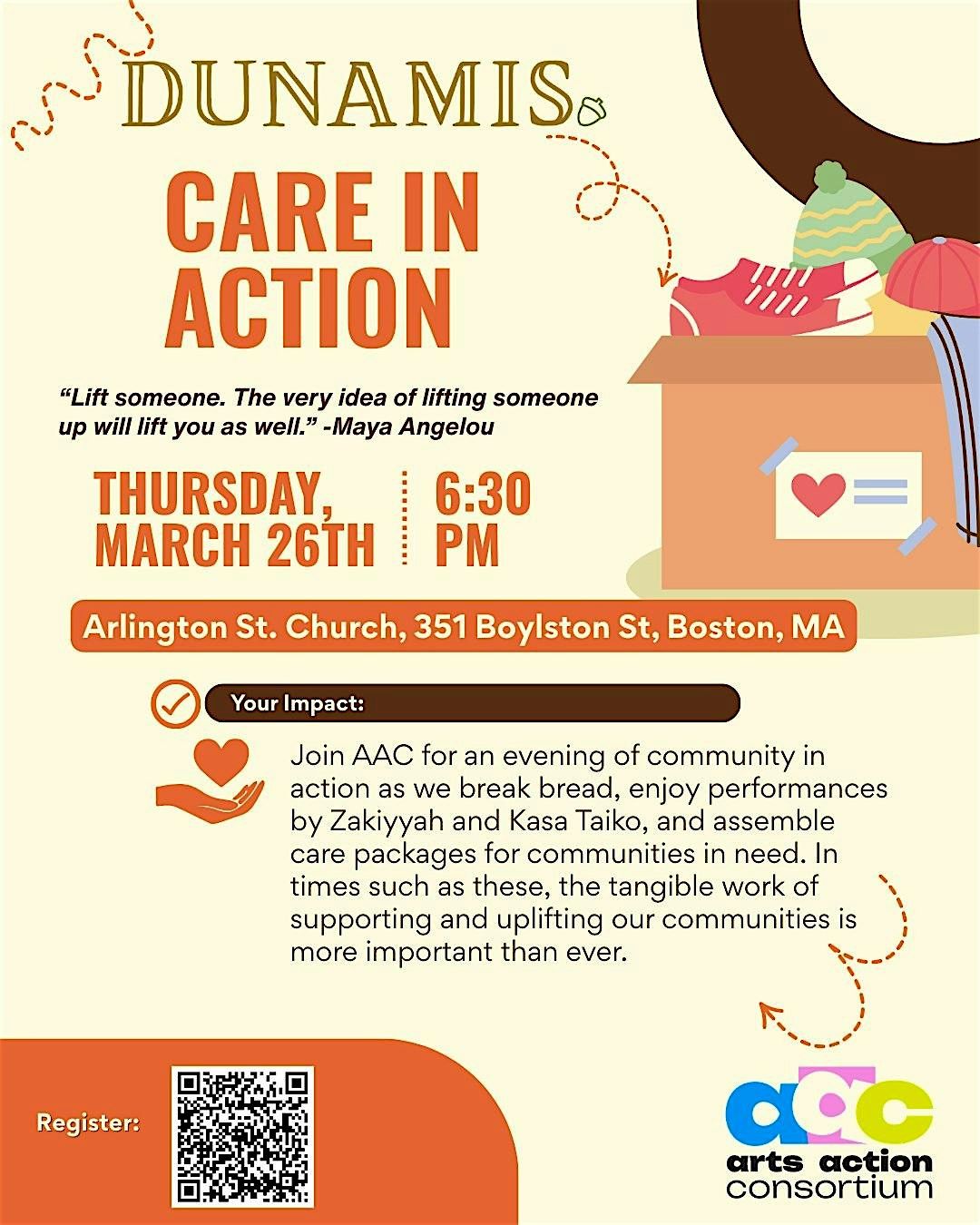 Join AAC for an evening of community in action as we break bread, enjoy performances by Zakiyyah and Kasa Taiko, and assemble care packages for communities in need. In times such as these, the tangible work of supporting and uplifting our communities is more important than ever.