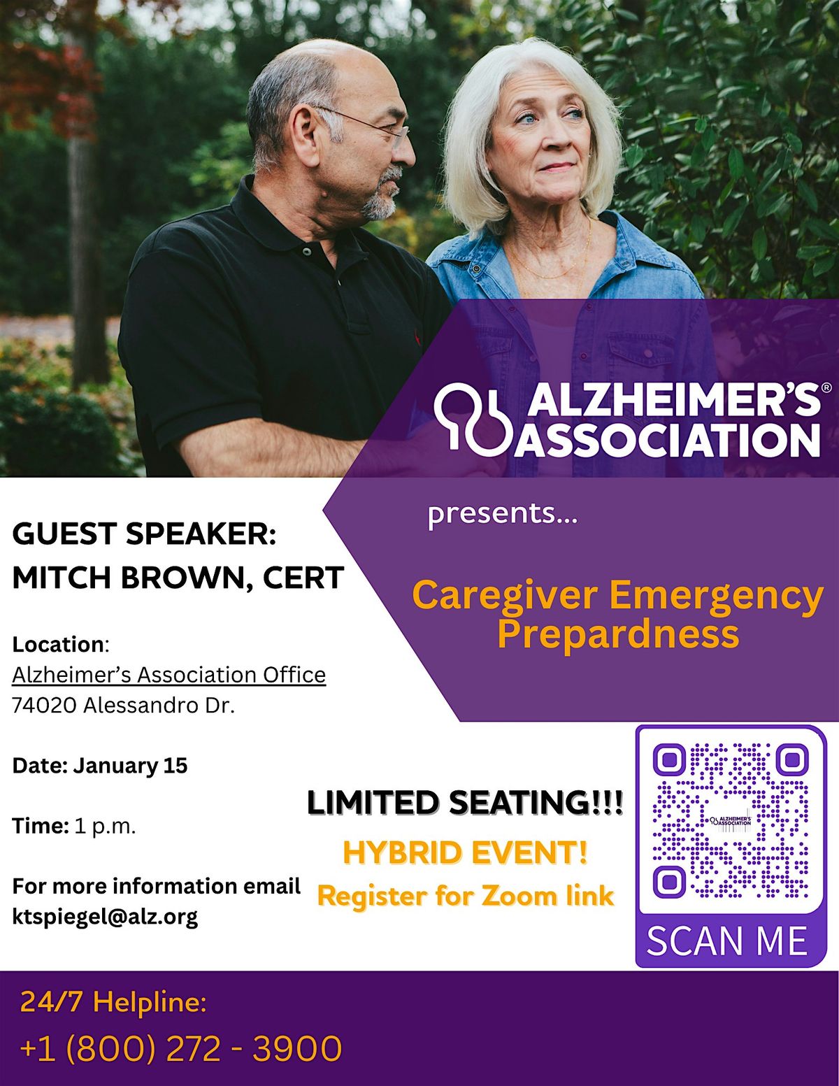 Welcome to the Caregiver Emergency Preparedness event happening at the Alzheimer's Association of the Coachella Valley! Join us on January 15, 2026, at 1:00 PM for an informative session on how to handle emergencies when caring for a loved one with Alzheimer's or other dementia. We'll discuss essential tips, resources, and strategies to ensure you're well-prepared for any situation.