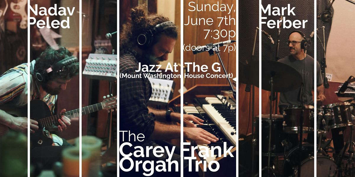 Join Carey Frank and his organ trio—featuring Mark Ferber (drums) and Nadav Peled (guitar)—at Jazz at The G, an intimate house concert series in Mount Washington.