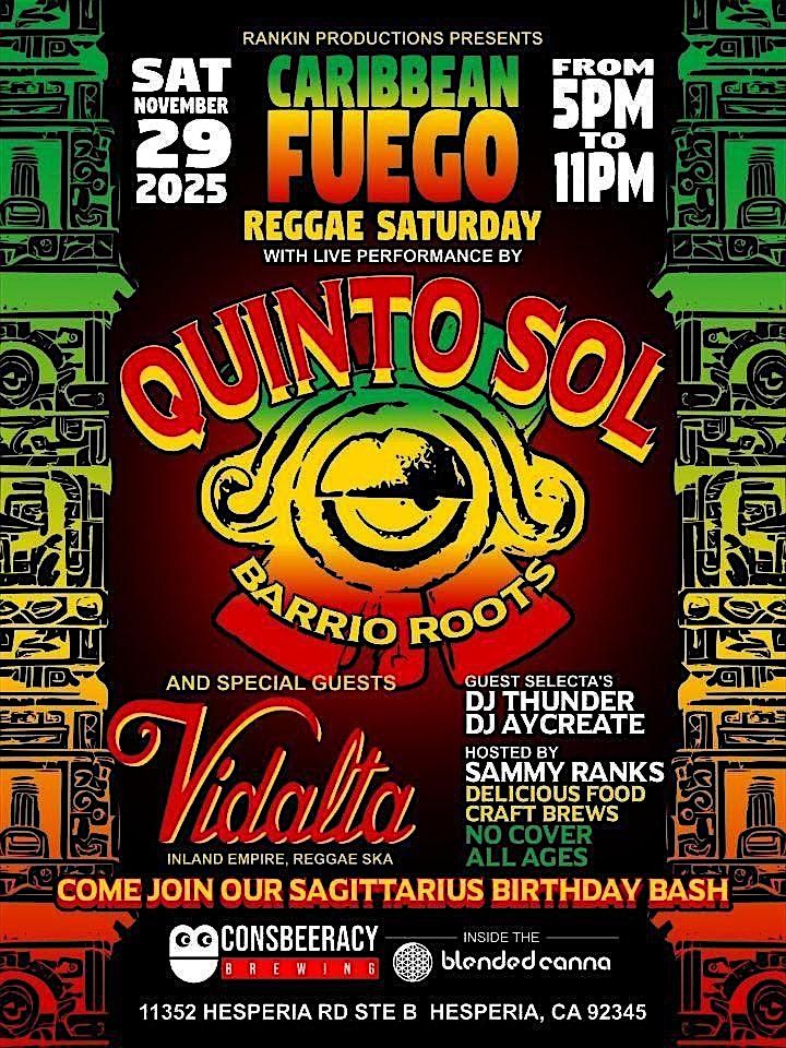 Caribbean Fuego Reggae Saturdays returns for our Sagittarius Birthday Bash & Grand Finale featuring Quinto Sol live with special guests Vidalta Reggae Ska. Expect uplifting roots, Mexica-roots reggae, cumbia fusion, DJs, dancing, and pure High Desert community vibes. Family-friendly with plenty of seating, games, and a full craft-beer bar with delicius mock-tails and kitchen with vegan options at Consbeeracy Brewing (11352 Hesperia Rd, Hesperia). All ages welcome, free parking, indoor comfort, and accessible facilities. Come celebrate the last event of the season with positive irie energy—Sagittarius reggae lovers, this one’s for you!