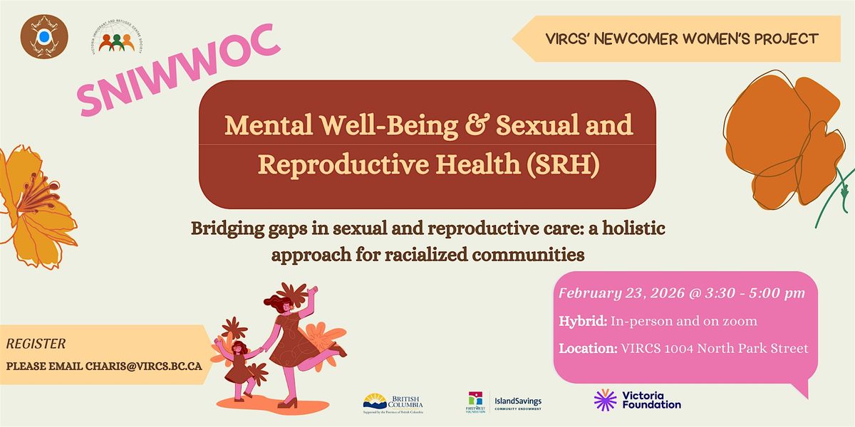 Join SNIWWOC and the Victoria Immigrant and Refugee Centre Society (VIRCS) for a welcoming and informative workshop focused on mental well-being and sexual and reproductive health (SRH).