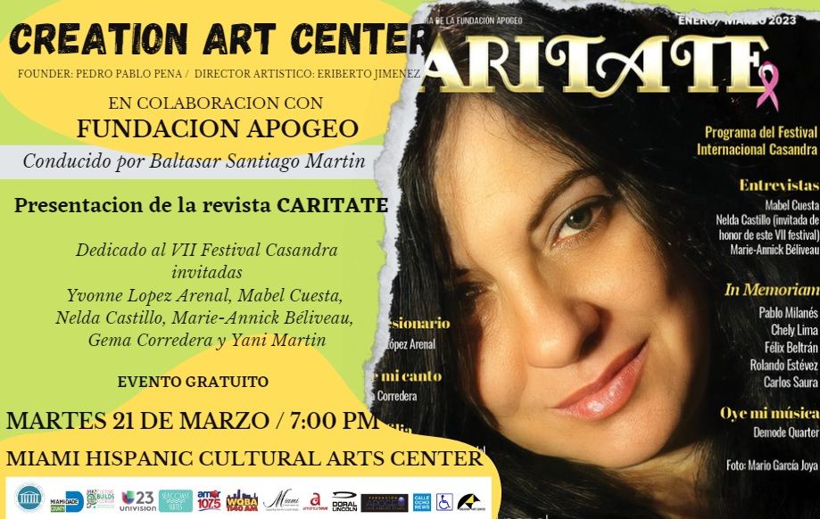 Invitación para la presentación de la edición especial de la revista CARITATE de enero/febrero/marzo de 2023, por el VII Festival Casandra y el XV aniversario de la Fundación APOGEO. Entrada LibreCreation Art Center, Centro Cultural Hispano para las Artes de Miami, dirigido por el Maestro Eriberto Jiménez; El Ingenio Teatro, dirigido por la actriz y directora teatral Lilliam Vega; la Asociación de Cronistas de Espectáculos de Miami (ACEM), dirigida por la periodista Paulina Fátima Aly, y la Fundación APOGEO para el arte público, tienen el gusto de invitarles a la presentación de la revista CARITATE de enero/febrero/marzo 2023, con la actriz y directora teatral Yvonne López Arenal en portada; la presencia de las creadoras entrevistadas para esta edición Mabel Cuesta, Nelda Castillo (invitada de honor de este VII Festival), Marie-Annick Béliveau y Gema Corredera –quien además cantará como cierre de amor del evento–, y la actriz Yani Martin, quien hará una lectura dramatizada del monólogo Los ojos de Bette Davis, de la autoría de Baltasar Santiago Martín, director de APOGEO y de CARITATE.
